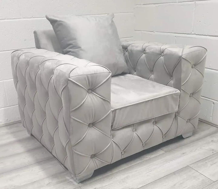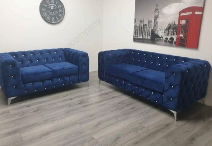The Italian Velvet Chesterfield Sofa is a stylish piece incorporating a classic chesterfield design with modern angles.